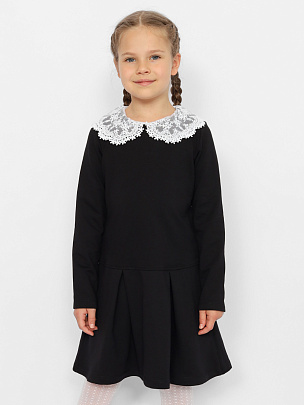 Платье для девочки с отрезной юбкой и кулиской со шнуром по шву притачивания юбки. Рукава короткие, со сборкой по окату. Горловина круглая, окантована бейкой из основного полотна. Перед платья декорирован принтом с вышивкой пайетками.