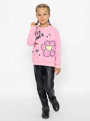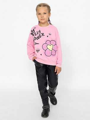 Джемпер для девочки с модным, трендовым принтом в стиле граффити (надпись: "Мой прекрасный цветок"). Крой оверсайз с заниженной линией плеча не сковывает движения, позволяя ребенку быть активным. Модель дополнена круглым вырезом горловины и длинными рукавами. Воротник, манжеты и пояс выполнены из полотна с эластаном.